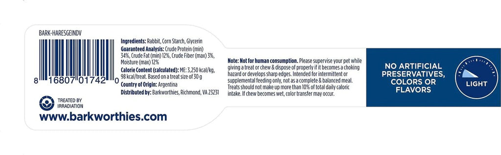 Barkworthies® Natural Rabbit Sausage is an approximately 6 inch long chew made of free-range, grass-fed Argentinian rabbit. Easily cut into smaller pieces, this all-natural dog treat can be given whole or cut down into popable pieces – perfect for a small dog treat or for use as a training aid!