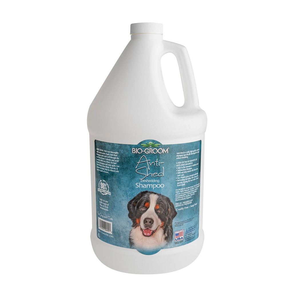 Bio-Groom Anti-Shed Deshedding Dog Shampoo is a top-quality, all-natural dog shampoo created to help minimize shedding. This anti-shedding shampoo for dogs is ideal for double-coated and long-haired breeds, working to reduce excess fur and keep coats looking their best. It loosens and removes stubborn hair and loose undercoat during bathing, cutting down on overall grooming time while making brushing easier. Plus, it cleans deeply without stripping natural oils, leaving the coat healthy and refreshed. Our anti-shedding dog shampoo helps decrease the amount of loose fur that leads to tangles and mats, promoting a smoother, healthier coat. The gentle formula washes out quickly and leaves no residue, ensuring a fresh, soft, and manageable finish. While effective year-round, it delivers the best results during seasonal coat changes when shedding is at its peak. This anti-shedding shampoo for dogs is free from parabens, silicones, and harsh chemicals. It’s cruelty-free, soap-free, and made with 100% biodegradable ingredients. The added Soy Protein helps strengthen the coat while boosting its natural volume. Safe for puppies, kittens, and the environment, it also works well with topical flea and tick treatments. Recommended by top breeders and professional groomers worldwide. For the best deshedding routine, pair Bio-Groom Anti-Shed Deshedding Dog Shampoo with our Anti-Shed Deshedding Crème Rinse to further reduce shedding and keep coats soft and manageable.