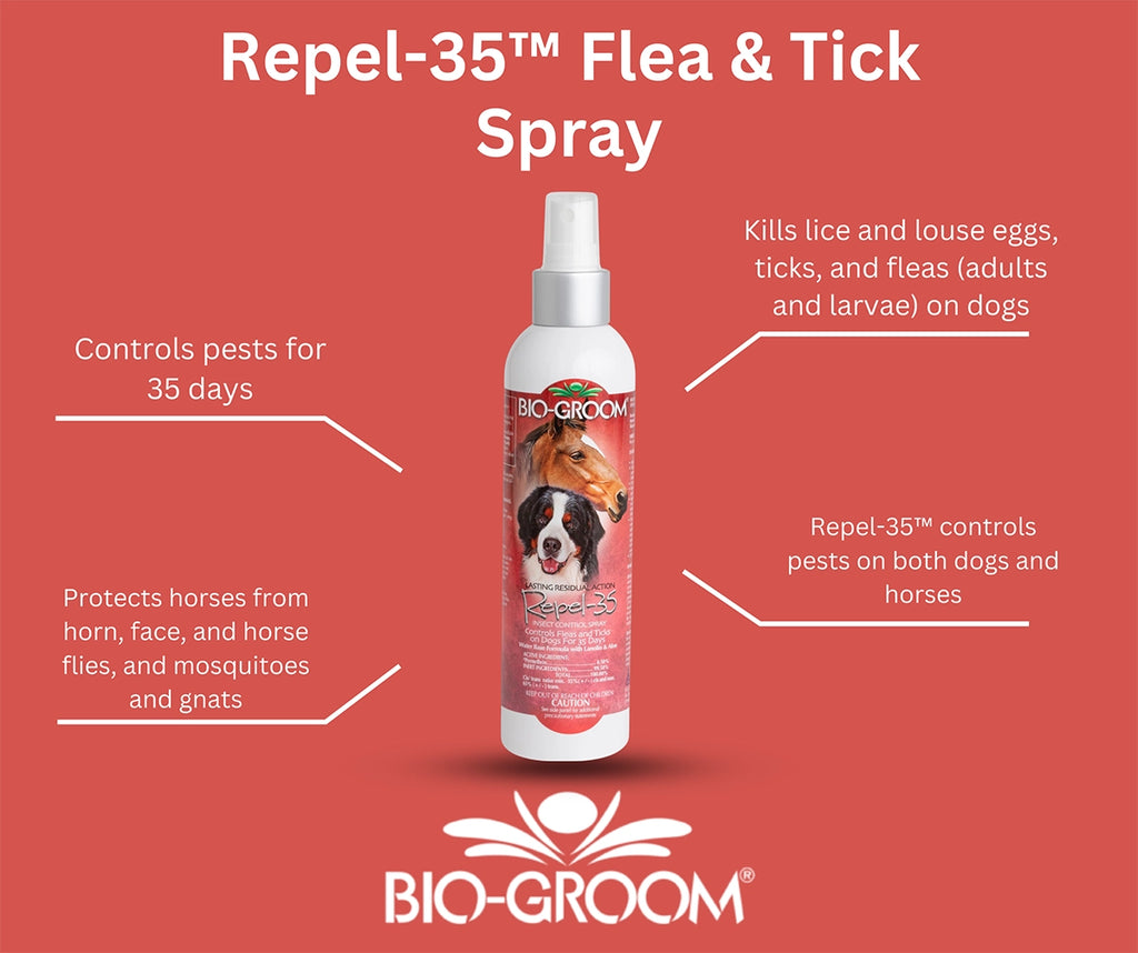 Repel-35™ is the most effective product on the market to control fleas and ticks. This flea and tick spray for dogs and horses features a gentle, non-irritating, water-based formula that is enriched with lanolin and aloe vera for dogs and horses with sensitive skin. The active, pest-fighting ingredient is Permethrin (0.50%). Residual action protects horses from horn flies, face flies, horse flies, mosquitoes, and gnats. Repel-35™ kills lice and louse eggs, ticks, and fleas (adults and larvae) on dogs. Protection lasts for 35 days, which enhances your pet’s health and happiness. This product is safe for repeated use, but please be sure to read the directions before purchasing and the entire label before each use.