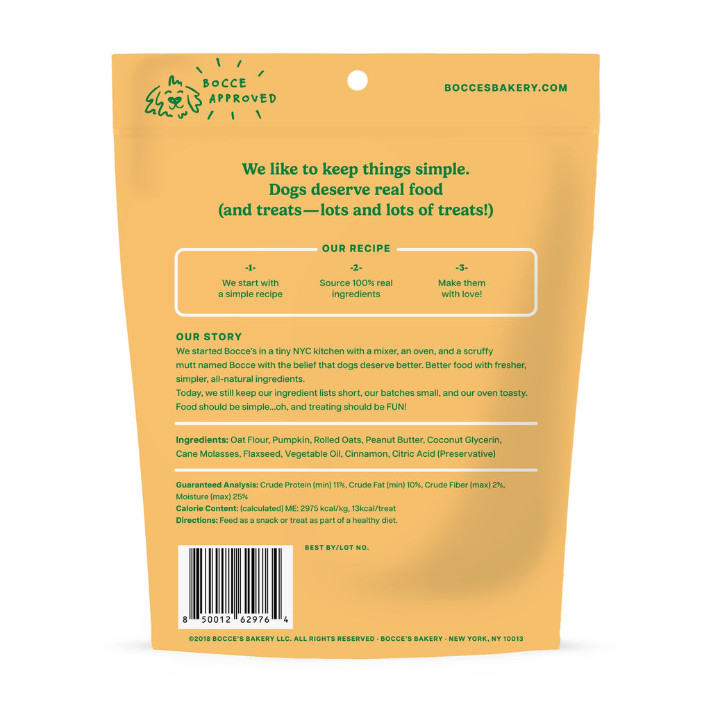 Ingredients: Oat Flour, Pumpkin, Rolled Oats, Peanut Butter, Coconut Glycerin, Molasses, Flaxseed, Vegetable Oil, Cinnamon, Citric Acid (Preservative)