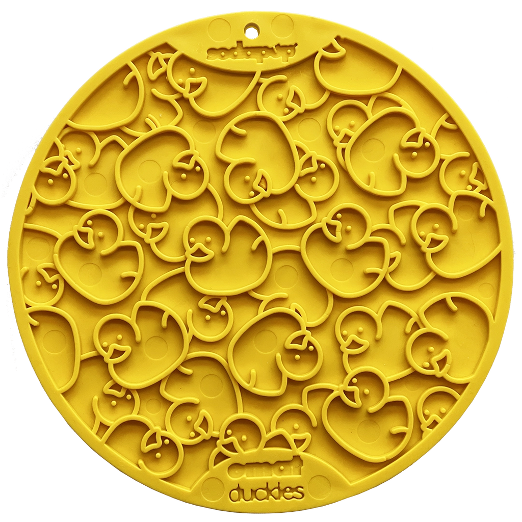 Rubber Ducky, you're the one! If your dogs are like mine, they don't love bath time. But that's about to change! Spread some peanut butter into the surface of the Duckies eMat and stick it on the side of the tub, giving your dog an enrichment distraction while taking a bath! The Duckies eMat features suction cups on the back making it ideal for sticking it to the tub, or the refrigerator, or to smooth tile floors.