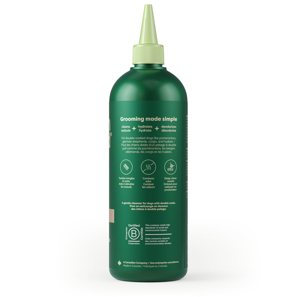 This 3-in-1 Dog Shampoo is tailored for double coats, combining cleaning, hydrating, and deodorizing in one quick step. Its deep-clean nozzle reaches deep into your dog's double coat to help tackle tangles and shedding. The gentle formulation is free from harsh chemicals and will leave your pup smelling fresh & clean. Formulated with jojoba seed oil to help moisturize the coat. For reliable coat care, because your dog means the world to us.