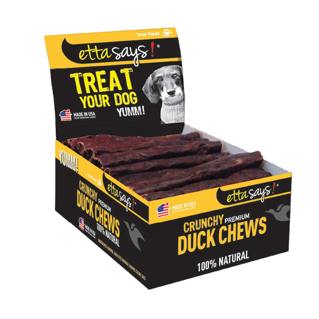 Do what Etta says and treat your pup to her pawsome Crunchy Duck Chews Dog Treats. These crisp, delightful treats are made without the use of artificial additives, fillers, coloring, preservatives or meat by-products—with the health of your fur baby in mind. Plus, they're made with limited ingredients to be easily digestible for all pups, even those with sensitive tummies. These high-protein, non-allergenic treats are made without grain, so they can help support a healthy skin and coat, while the unique, chewable texture promotes good dental hygiene while your pup chews. Best of all, they're made in the USA with natural ingredients from American farms! So, you can trust that you're giving the absolute best to your absolute best pal.