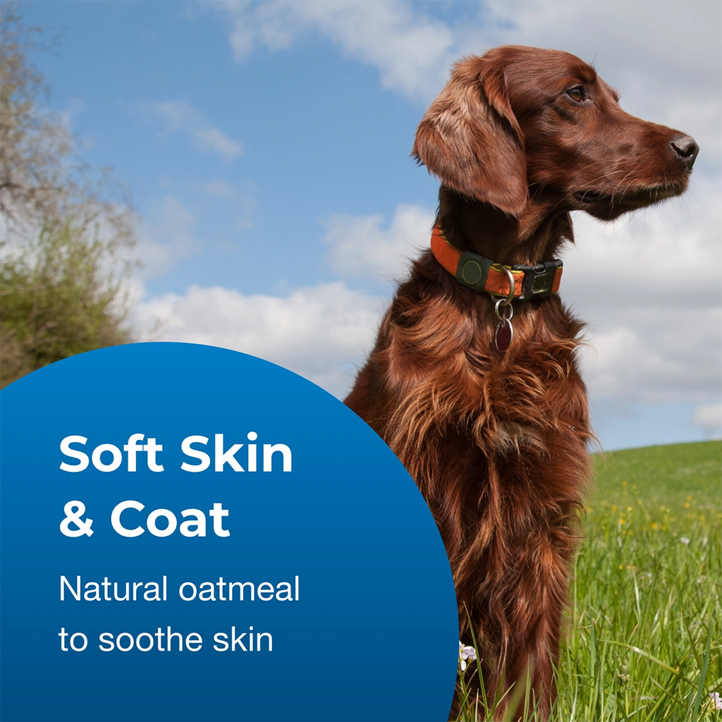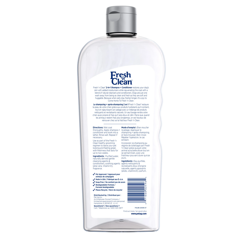 Clean and condition in one easy step with Fresh ’n Clean® 2-N-1 Oatmeal Conditioning Shampoo in Tropical Scent. The oatmeal formulation helps relieve skin irritation and control odor. Delivers a deep clean and also contains vitamin E and Aloe vera to protect and moisturize the skin and coat. The Fresh ’n Clean signature, long-lasting scent keeps your dog smelling fresh up to two weeks.