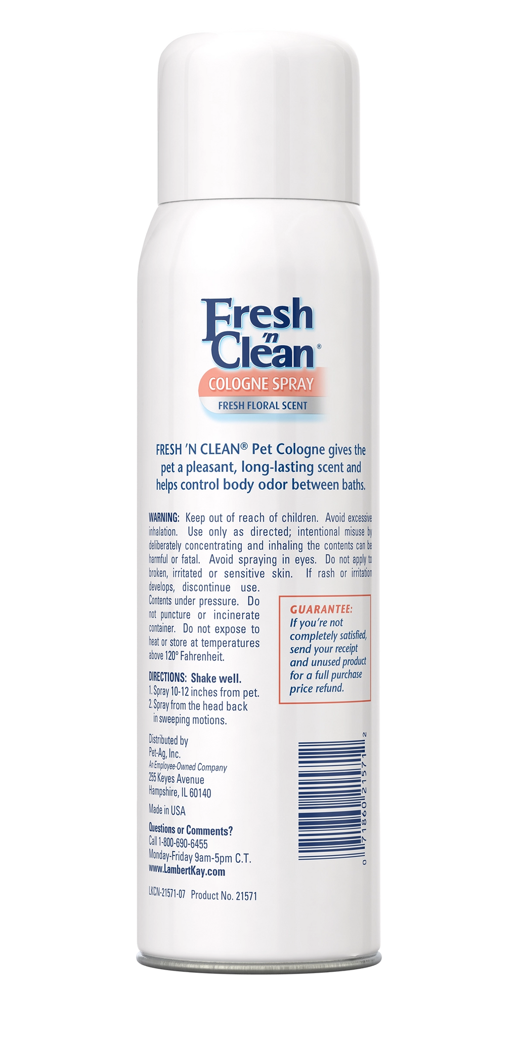 Keep pets smelling fresh between baths or trips to the groomers with Fresh ’n Clean Cologne Spray. No water, lathering or mess. Just spray the gentle, ready-to-use formula from nose-to-tail for instant freshness.