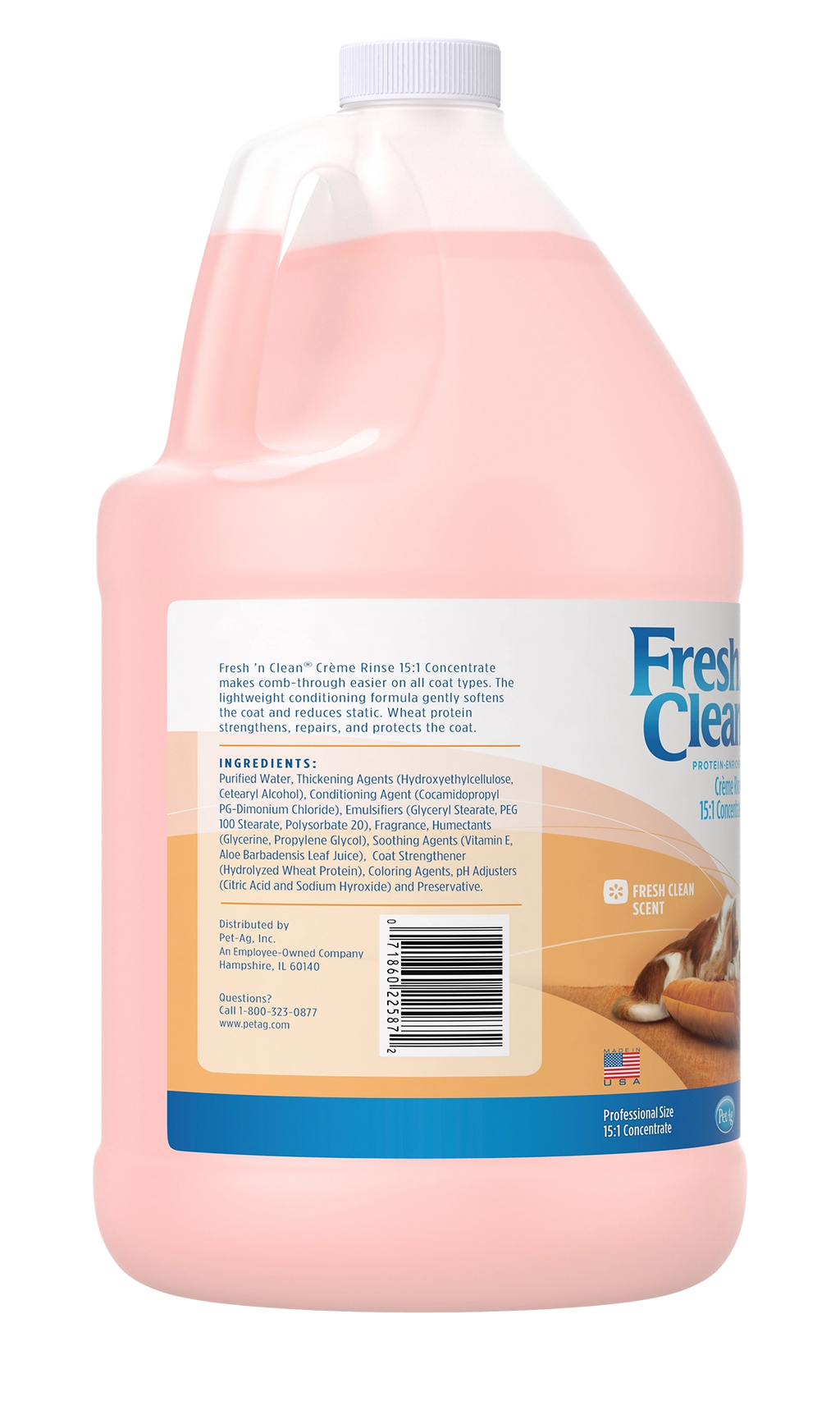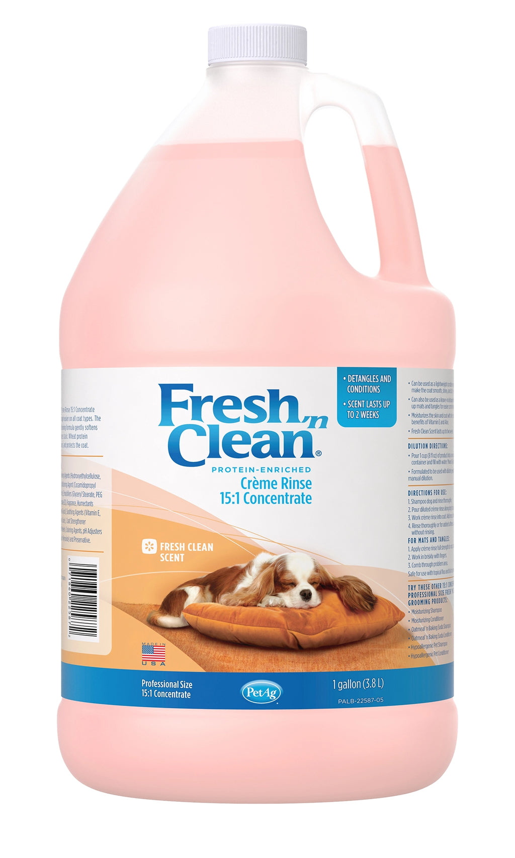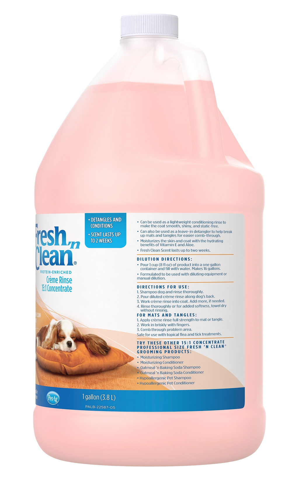 Deliver a pleasing fragrance that lasts from one grooming to the next with Fresh ’n Clean® Crème Rinse. Formulated with a lower pH, it seals the hair cuticle and locks in the moisturizers, protein and nutrients from our shampoos and conditioners. It’s a crucial step in the grooming process that helps lubricate, smooth, soften and relax the coat – thus reducing static, mats and tangles and making comb-through easy. The result is a shimmering coat that’s soft to the touch. The 15:1 concentration saves on shipping costs with more washes per bottle. And the Fresh ’n Clean signature, long-lasting fragrance keeps your dog smelling fresh up to two weeks.
