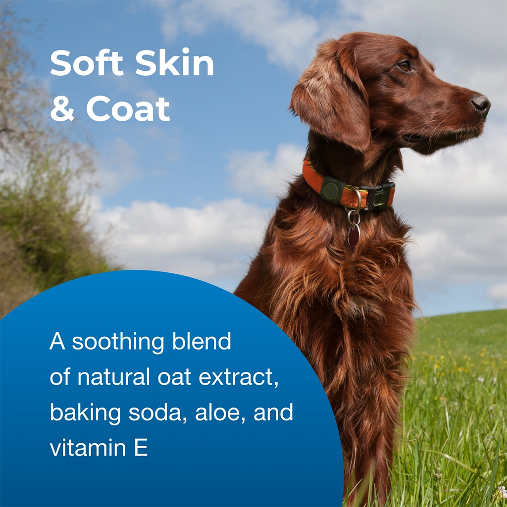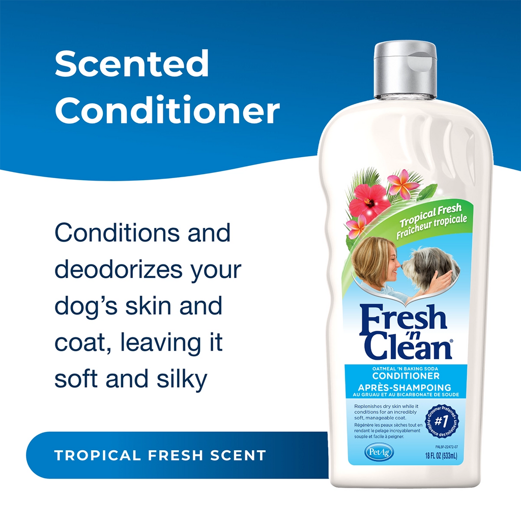 Gently cleanse, soothe and deodorize pets after shampooing with Fresh ’n Clean® Oatmeal ’n Baking Soda Conditioner. A blend of natural oatmeal, baking soda, vitamin E and Aloe vera produces a shimmering coat that’s soft to the touch. The natural, pure oat flour formulation delivers relief to dogs experiencing sensitive, itchy or irritated skin. Infused with plant-based conditioning agents to moisturize the skin and coat, it also eliminates mats and tangles to reduce breakage and cut down on grooming time. The Fresh ’n Clean signature, long-lasting scent keeps your dog smelling fresh up to two weeks.