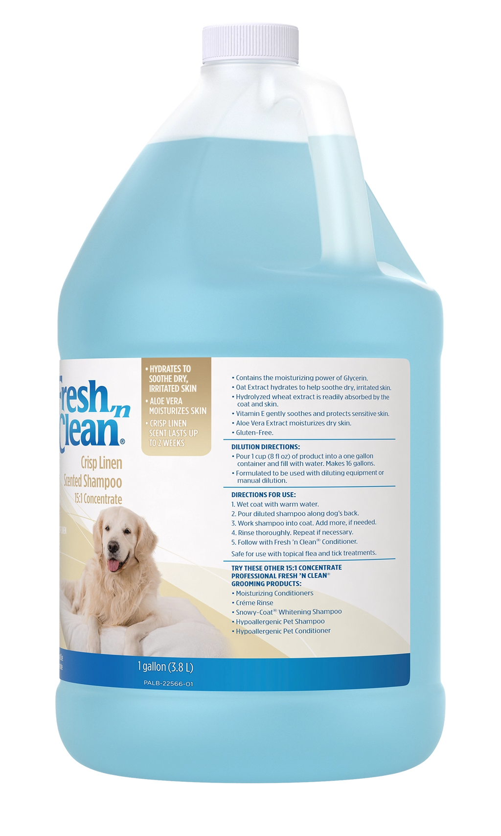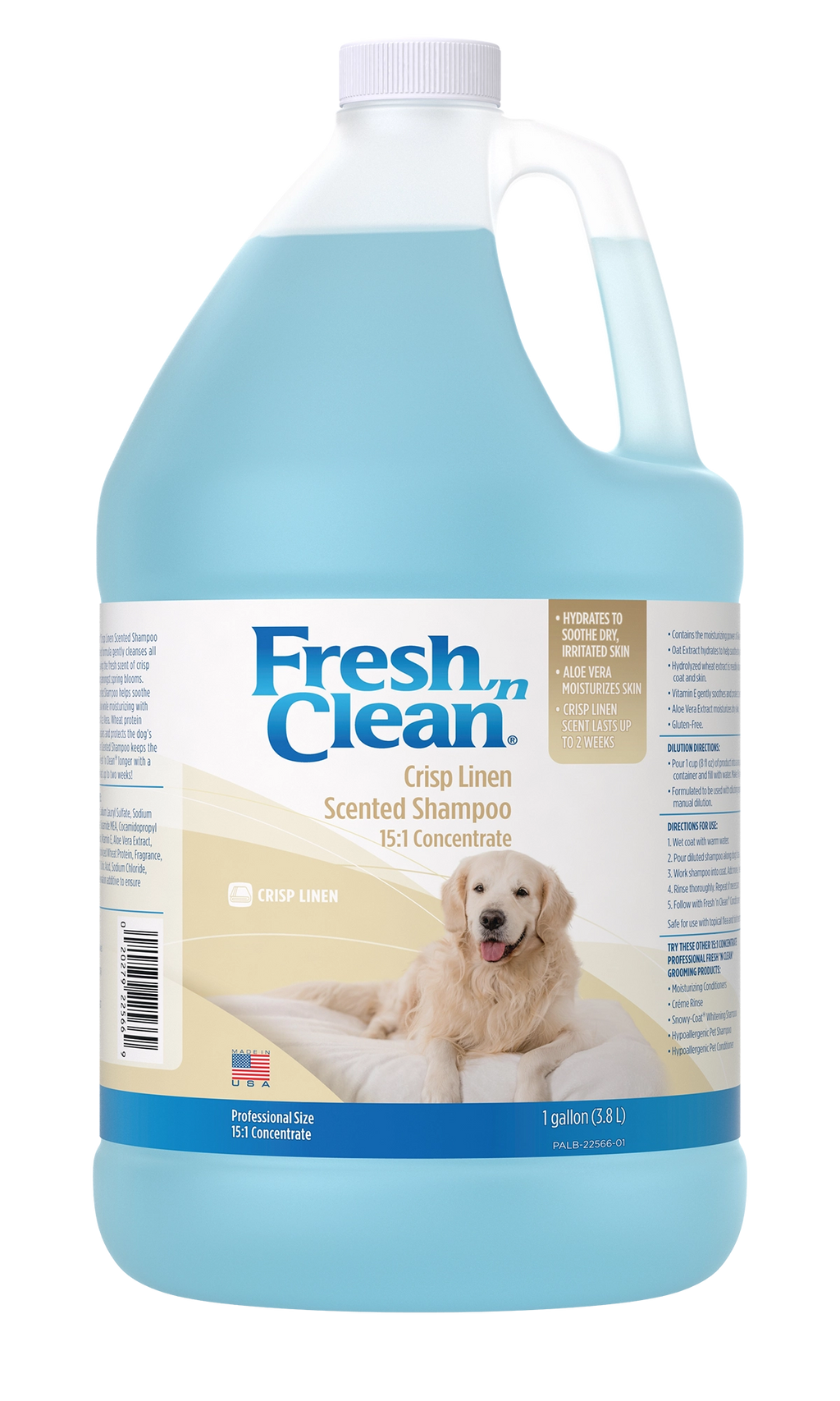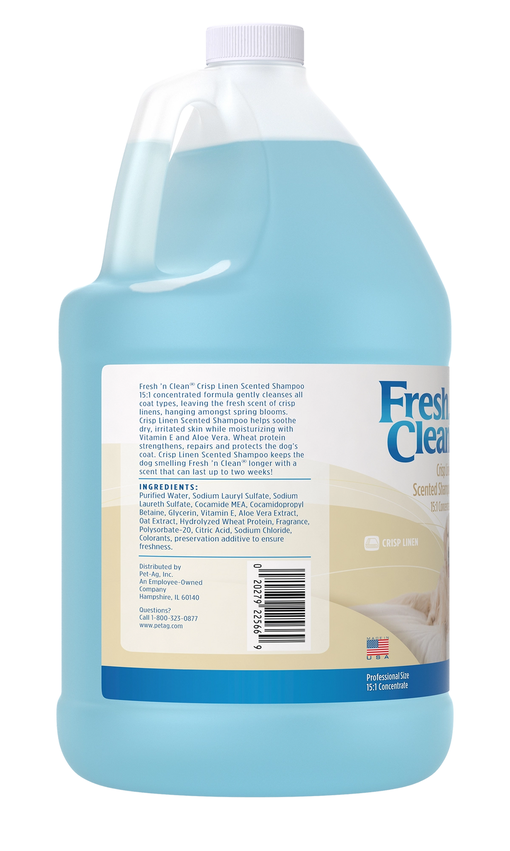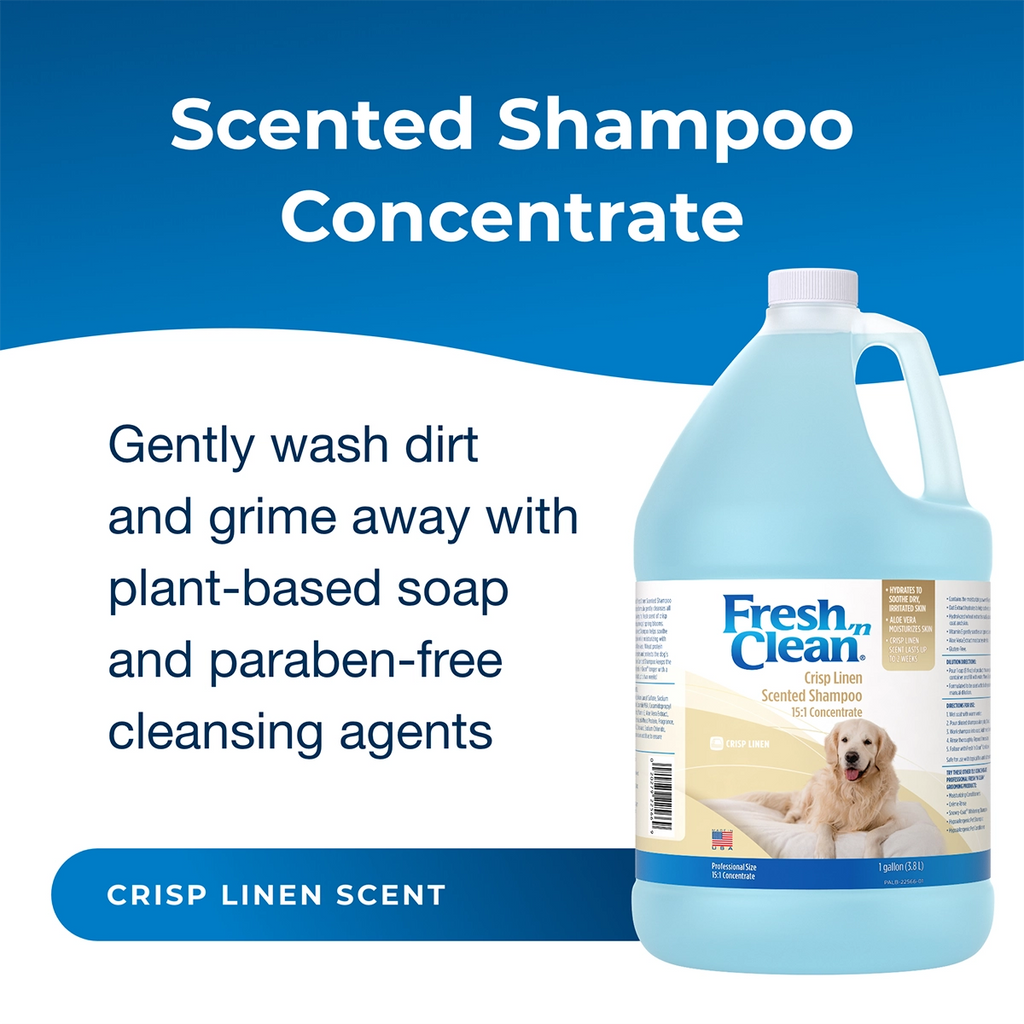 Fresh 'n Clean® Crisp Linen Scented Shampoo 15:1 concentrated formula gently cleanses all coat types, leaving the fresh scent of crisp linens, hanging amongst spring blooms. Crisp Linen Scented Shampoo helps soothe dry, irritated skin while moisturizing with Vitamin E and Aloe Vera. Wheat protein strengthens repairs and protects the dog’s coat. Crisp Linen Scented Shampoo keeps the dog smelling Fresh 'n Clean® longer with a scent that can last up to two weeks!
