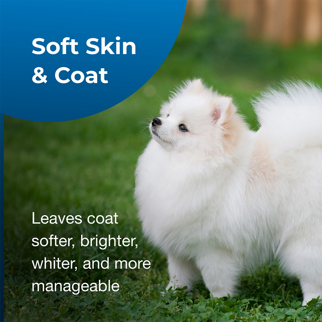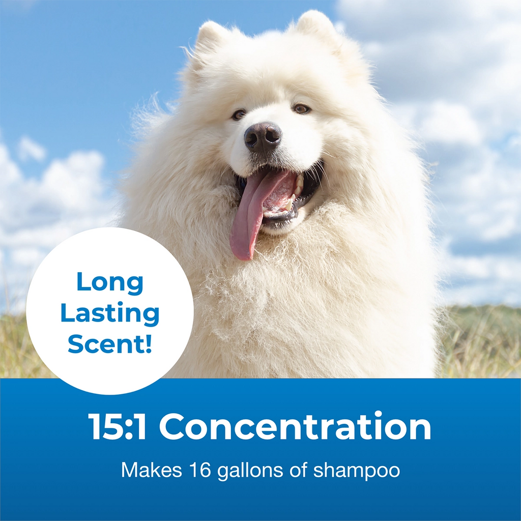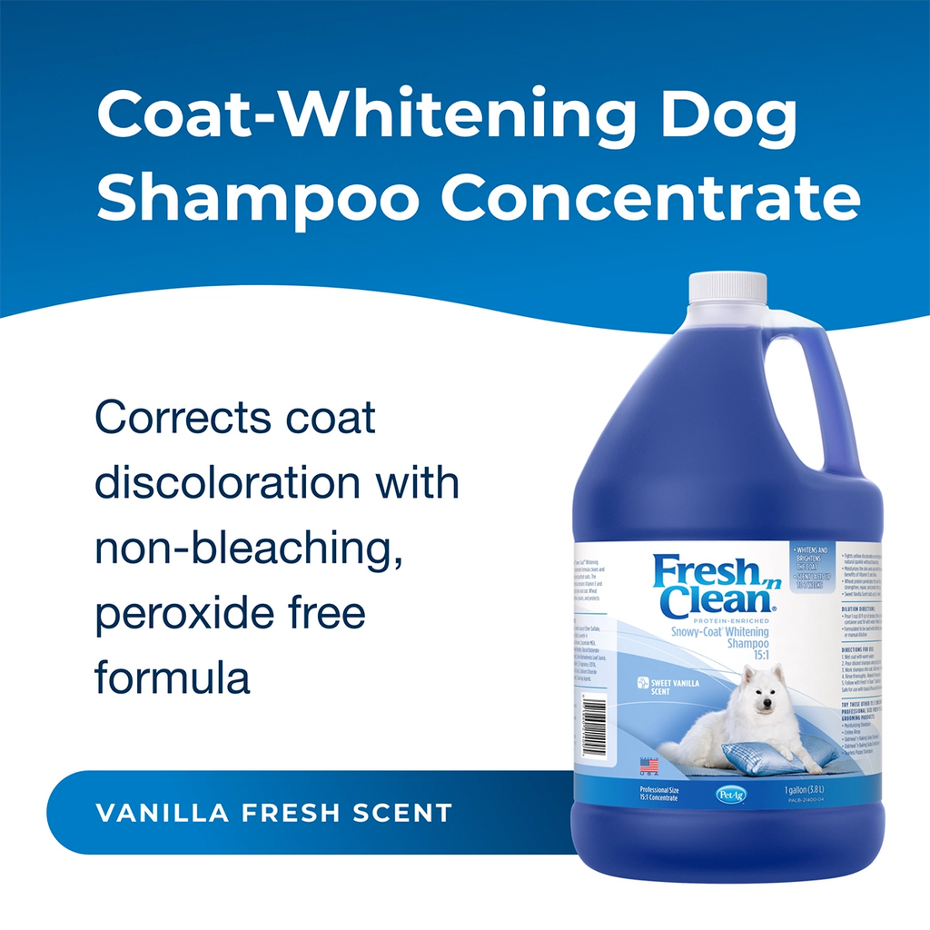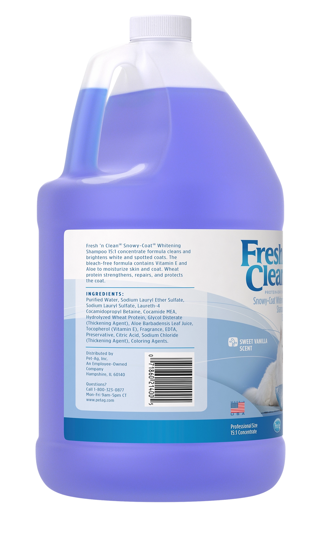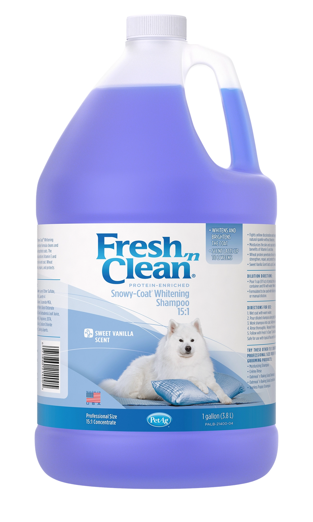 The preferred choice of groomers, Fresh ’n Clean Whitening Snowy-Coat® Shampoo removes stains and brightens coats without bleach. It’s ideal for dogs with light and spotted coats and those with discoloration around the muzzle. The mild, soap-free formula features plant-derived cleansers enriched with skin-soothing aloe extract and protein to strengthen the coat and fight yellow residue without drying. The rich, penetrating lather easily washes away dirt and debris, leaving the dog clean and refreshed. The 15:1 concentration saves on shipping costs with more washes per bottle. And the Fresh ’n Clean signature, long-lasting fragrance keeps your dog smelling fresh up to two weeks.