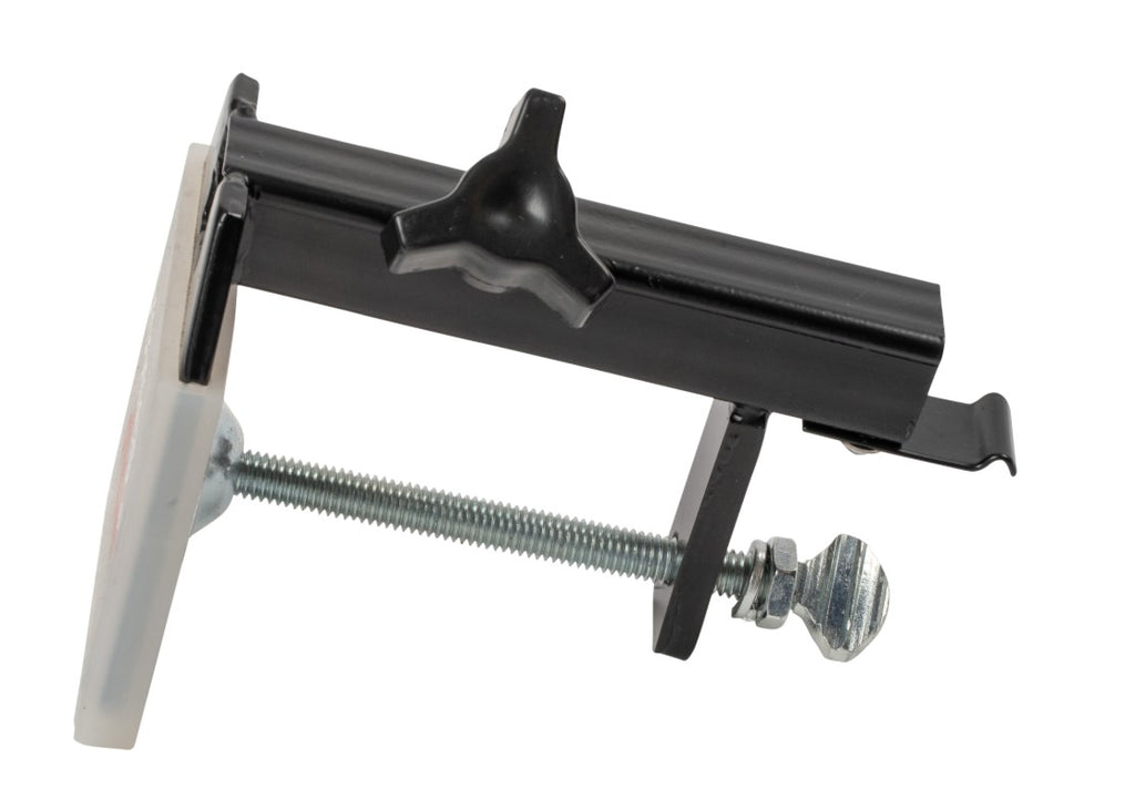 Description This ¾" side clamp features a heavy-duty welded steel construction for years of use. There is a spring steel tension clip at the bottom to prevent the grooming arm from sliding down while adjusting the height, and a silicon pad on top to help keep the clamp from damaging the grooming table top. This side clamp is designed for use with the Groomers Helper® Professional set on Non-Standard tables. A Non-standard table has a table top that is over 1" thick – it may be home made, or a lighted grooming table, or a table that has a metal frame holding the top on.