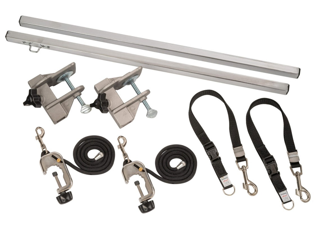 Includes: (2) Groomers Helper® Starter Sets (2) Table Clamps (2) Mini Arms And directions to our comprehensive training Videos. Stop Struggling and groom hands-free! Stop the biters! No more head-droppers and no more spinners! One person can do most nail clips and you will wonder how you ever groomed without it. Significantly reduces injuries to both pets and groomers alike! Includes everything you need to safely position a dog on the grooming table. You can prevent dogs from sitting, face them away from the grooming arm for better top knots and beards, and position them in a tri-tie for face work.
