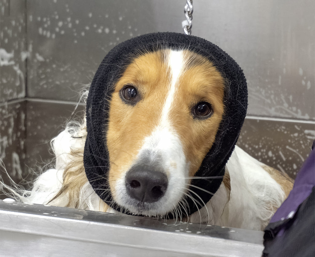 Happy Hoodie is a soft, expandable, fabric calming band. Its gentle compression reduces noise and has a swaddling effect that relieves anxiety and calms dogs and cats during stressful situations in the home, grooming salon, and Vets. It is best known for keeping dogs calm during the force drying process. Common reasons for Grooming Salon use: Force drying, Bathing, Clipper work, Trimming nails, Brushing/dematting, Touchy on feet, Nervous about being there, Aggressiveness. Grooming benefits include: *Swaddling effect and noise reduction calms upset, disagreeable pets *Contributes to the safety of both pet and groomer or pet owner *Saves valuable time in the grooming salon *Speeds up drying time by wicking water from the ears and face *Helps to protect pets hearing *Comes in 4 sizes to accommodate all dog and cat sizes. HOME USES- CALMS PETS DURING STRESSFUL EVENTS, such as: Thunder, Fireworks, Gunfire, Vacuuming, Noisy environment, Toenail trimming, Brushing, Bathing, Blow drying, Paw handling, Car rides, Visitors, Vet exams, Keeps head warm, Aerates ears, Prevents and aids in healing Hematomas. Happy Hoodie has gentle compression that creates a swaddling effect and reduces noise to naturally calm upset pets. Keeps pets calm during Thunderstorms, Fireworks, Grooming (most importantly during Force Drying), Vet exams, Car Rides, and any other potentially stressful/noisy situation. Can prevent/heal hematomas