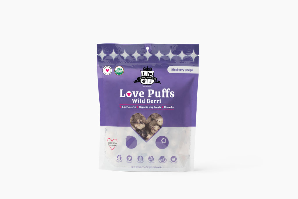 Love Puffs Wild Berri - A bright blend of organic blueberry and coconut! Lord Jameson is thrilled to offer a brand-new collection unlike anything we've offered before! Love Puffs are lovingly crafted to offer a light and crunchy treating experience without any artificial flavors or colors. We roll each ball in organic, plant-based colored coconut shreds. Our Love Puffs are low-calorie & low-sugar. Perfect for all dogs - whether they're watching their waistline or not! And there's plenty to share with over 150 balls per bag!