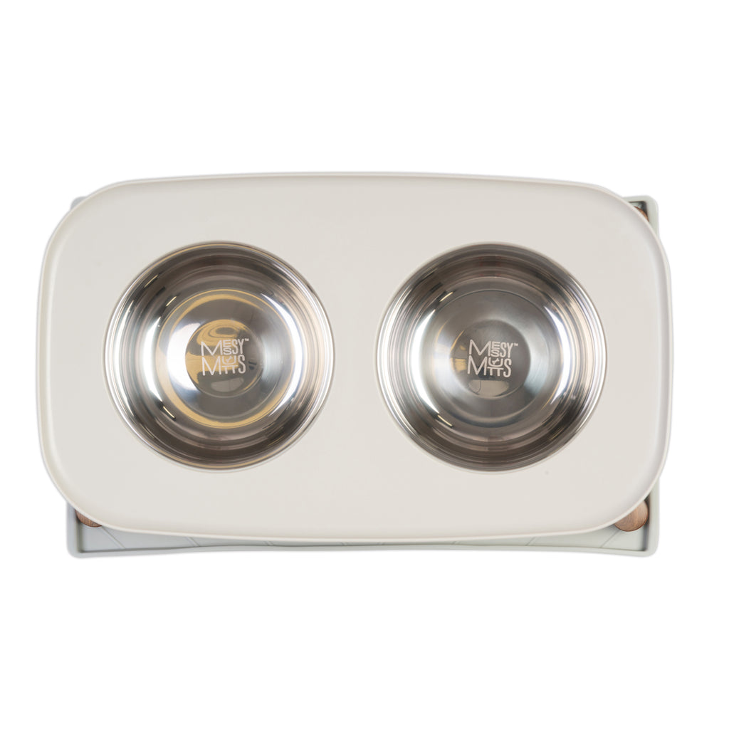 The raised lip around the border helps to contain spills and channels everything back to bowls. The ABS deck is non-porous, BPA / PVC free, and is molded underneath the each bowl to keep any mess off your floor.