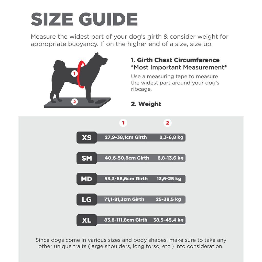 SIZING BASED ON GIRTH: Dogs come in all shapes and sizes. Whether your dog is short and stout or long and lanky, there's a dog life jacket fit for them. Available in sizes XS-XL and featuring adjustable straps, we've made it easy for you to choose a size that supports them based on their girth measurement. We recommend sizing up if the dog's girth size is on the higher end of this size.