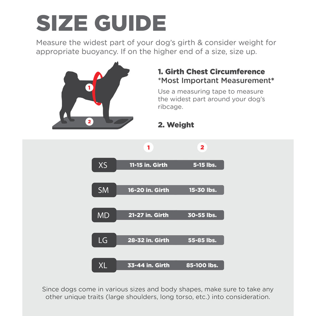 SIZING BASED ON GIRTH: Dogs come in all shapes and sizes. Whether your dog is short and stout or long and lanky, there's a dog life jacket fit for them. Available in sizes XS-XL and featuring adjustable straps, we've made it easy for you to choose a size that supports them based on their girth measurement. We recommend sizing up if the dog's girth size is on the higher end of this size.