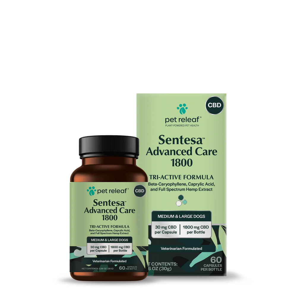 Our Sentesa Advanced Care capsules were developed with senior pets in mind. Sentesa’s combination of BetaCaryophyllene, Caprylic Acid, and Full Spectrum Hemp Extract creates a synergistic effect in your pet’s body to support their: immune system, enhance bone health, and support a healthy brain.