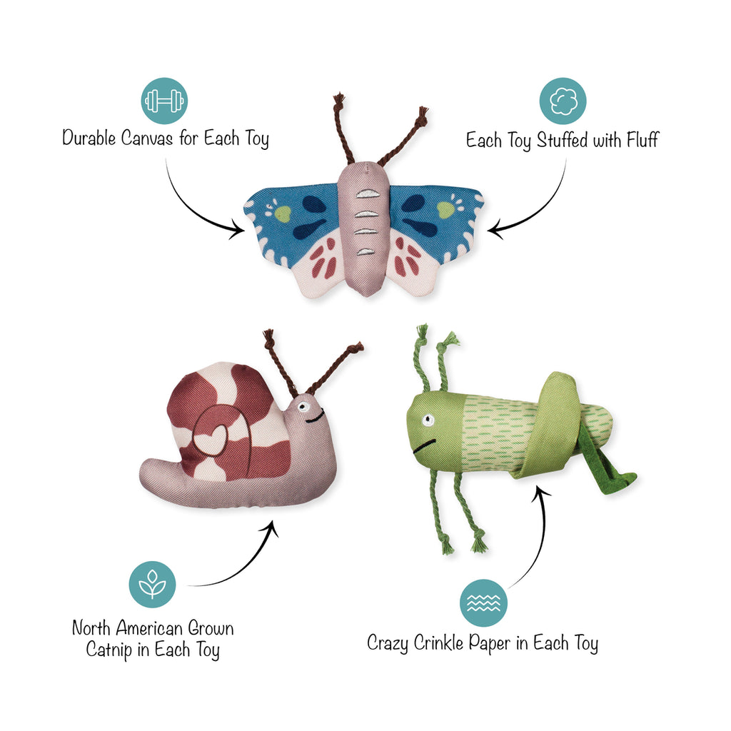 Petshop by Fringe Studio's “Catch Me If You Can” 3 piece mini toy set is purrfect for the quick kitty. Made with durable cotton canvas, North American grown catnip, crazy crinkle paper, and dangling rope, these toys were designed with interactive play in mind and a look that complements modern home décor. Whether your cat likes to pounce, bat, or chase, this trio is a hoppin' good time.