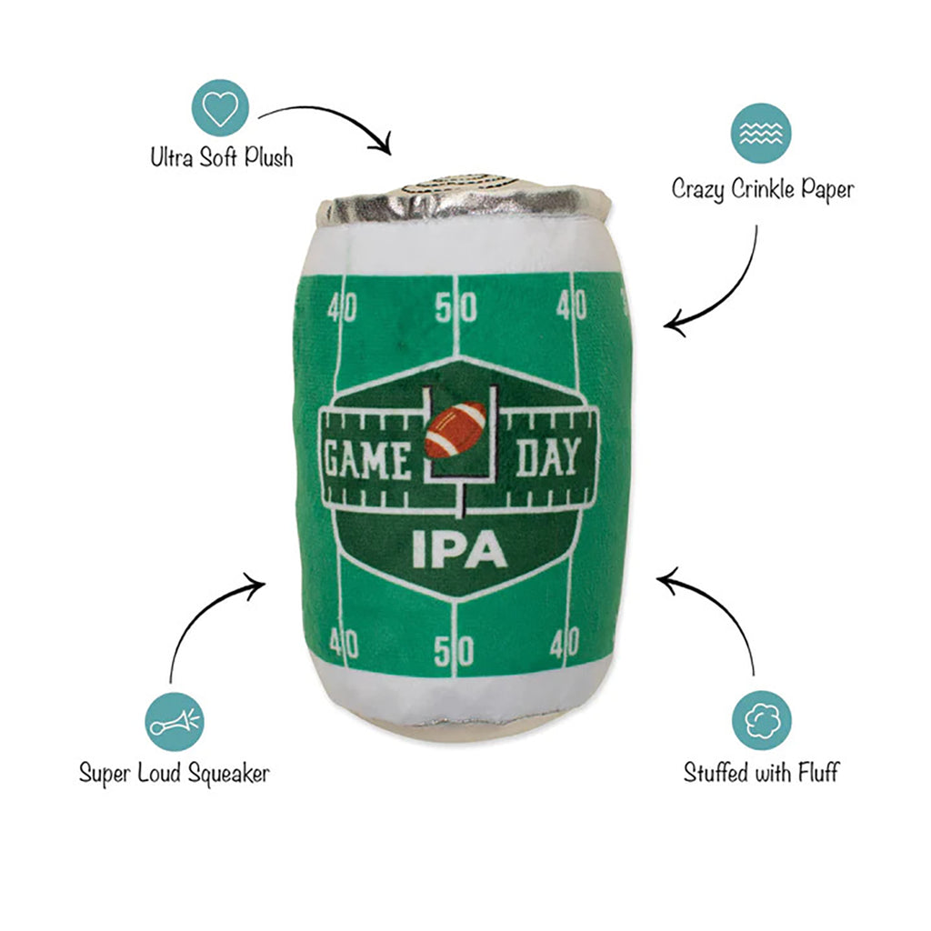 Win or lose, we still booze! Pet Shop by Fringe Studio “Game Day IPA” is perfect for playtime, anytime. Made with a super loud squeaker and crazy crinkle paper details, this toy was designed with interactive play in mind. Whether you squeak, crinkle or roll it, this beer will be your pups number one draft pick. Great for all sized dogs and not intended for aggressive chewers..