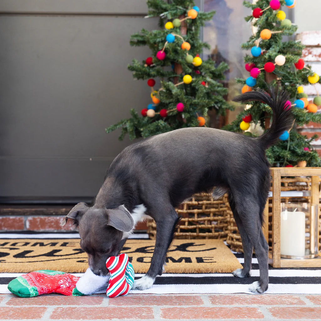 Stocking up for the holidays! PetShop by Fringe Studio “Merry Woofmas” burrow bag toy set is made for active pups that enjoy interactive puzzle toys. This burrow bag set includes 2 mini toys each with a with a loud squeaker and crazy crinkle paper in the burrow bag. Simply hide the mini toys inside the burrow bag, squeak the mini toy or crinkle the bag and watch your dog try to get the toys out of the bag. This boredom buster will have your pup thinking stocking stuffers have never been so much fun. Great for small dogs and not intended for aggressive chewers.