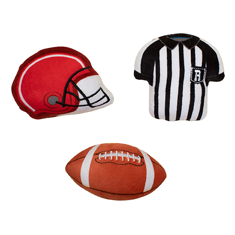 One team, one dream! Our “Whole 9 Yards” 3 piece mini plush toy set is perfect for the pup that likes to play all day. With each toy stuffed with fluff and a loud squeaker, this trio is sure to be a touchdown.