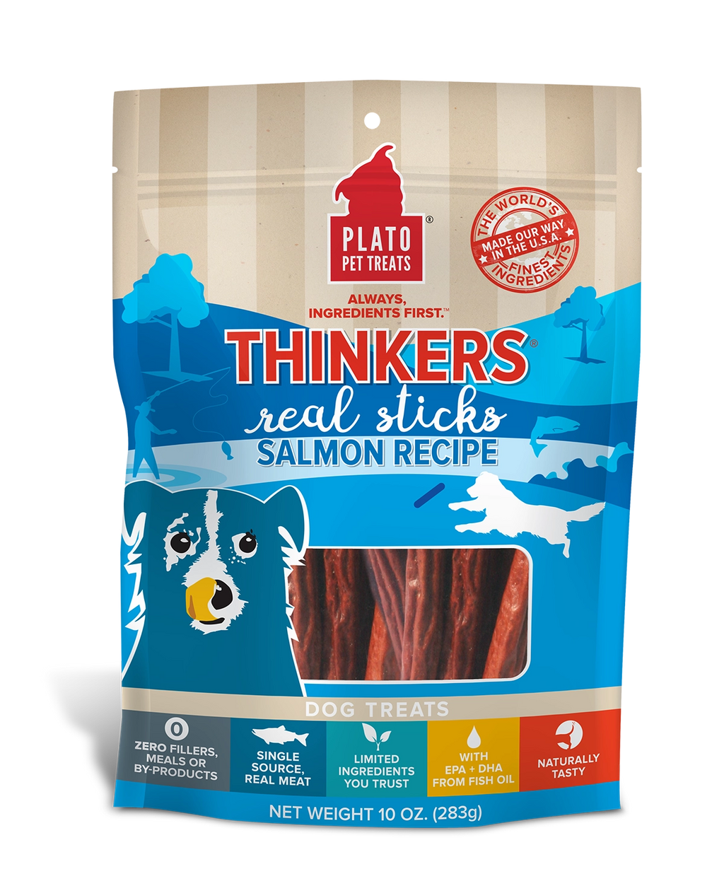 Thinkers are hearty, meat-packed sticks with added EPA and DHA to support healthy brain function. Made with real meat as the 1st ingredient, these treats are made with limited ingredients, are naturally preserved, and contain no artificial flavors, corn, wheat, or soy. Because of their large size, Thinkers offer substantial chewing satisfaction or can be broken into smaller pieces to create multiple treats. And we take the extra time to air-dry them in batches in our USA facility instead of baking them in order to retain more of the ingredients’ inherent nutrients (but your dog will just think that they smell and taste amazing). It takes longer, but we think its worth it.