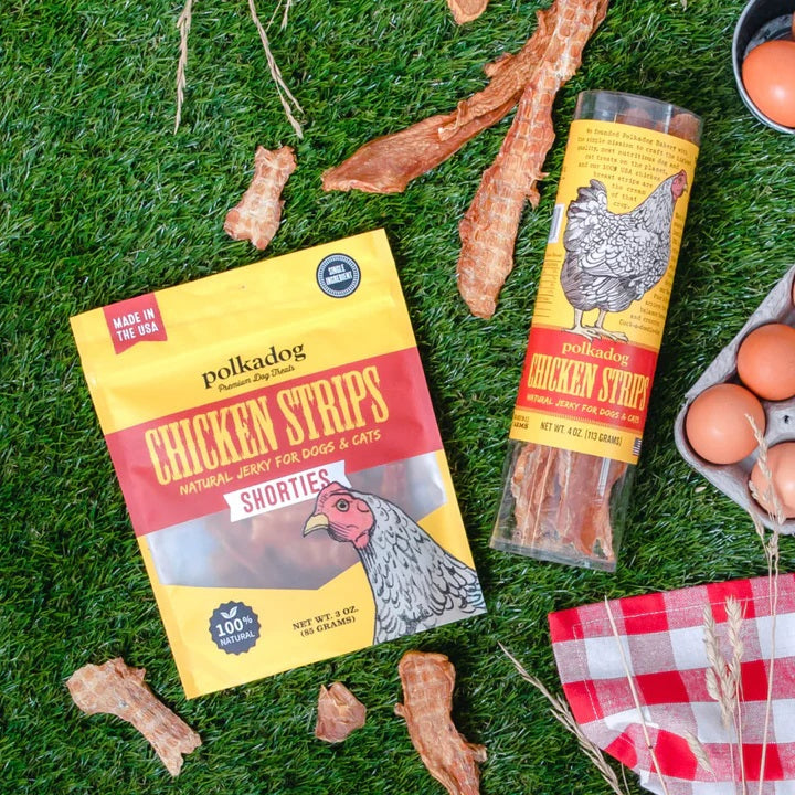 We founded Polkadog Bakery with the simple mission of crafting the highest quality, most nutritious dog and cat treats on the planet, and our 100% USA chicken breast strips are the cream of that crop. Each batch of chicken strips for dogs starts with locally sourced USA farm-raised chicken. We hand strip and gently dehydrate the chicken in our Boston kitchen to achieve the perfect balance between meaty and crunchy. Cock-a-doodle-doo!