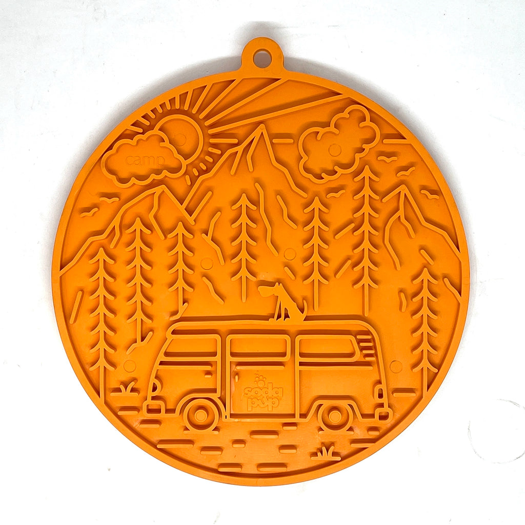 Add some fun to your next road trip or van life adventure with our Camp eMat Enrichment Lick Mat. Designed for the great outdoors, this orange mat features suction cups on the back for easy use in your caravan. Keep your furry friend entertained with this quirky and playful enrichment mat!