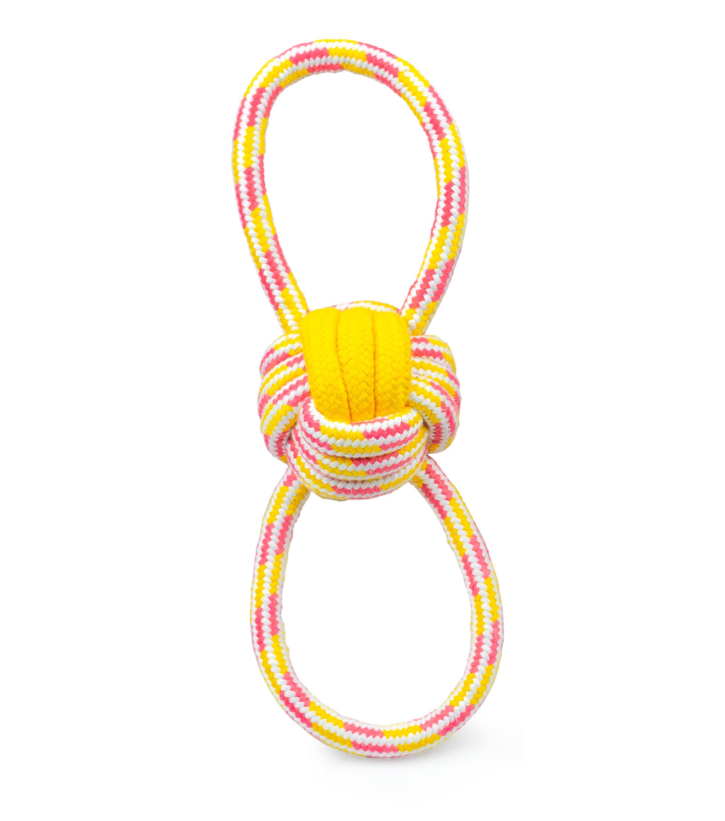 Enjoy double the fun with the ThoozyPet Figure 8 Knot Ball Rope Dog Toy 11.5” in Yellow and Pink! The unique figure-8 design features two looped handles connected by a sturdy rope ball that's securely nestled in the middle. This configuration offers multiple play options to keep your furry friend engaged. The handles are perfect for tugging and chewing while the ball adds a fun fetch element to the mix. The vibrant yellow and pink color scheme not only looks great, but also helps the toy stand out during outdoor play. Crafted from durable materials including strong rope fibers, this toy is built to withstand enthusiastic play sessions. The varied textures provide a satisfying mouthfeel that dogs love while also helping to clean teeth and promote good oral health. Its size makes it suitable for all dog breeds. Whether you're using it for a game of fetch, tug-of-war or allowing your pup some solo play time, this versatile toy offers endless possibilities for fun. Made from pet-safe materials you can feel confident knowing your dog is playing safely while getting both mental and physical stimulation. Ready or know, it’s time to play!