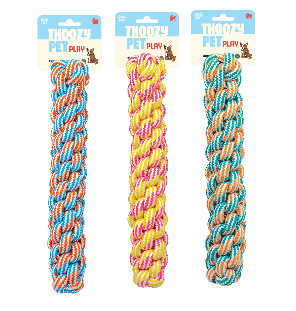 Elevate your fetch game with the ThoozyPet Knotted Fetch Stick Rope Dog Toy in Orange and Teal! This innovative 12.5” toy brings a new twist to the classic stick-fetching experience with a saf,e durable, and colorful design. Constructed from strong rope, the bold Orange and Teal color combination not only looks striking but also ensures high visibility during outdoor play sessions. The knotted structure provides excellent grip points for both you and your dog, making it ideal for interactive tug-of-war games in addition to fetch. Made from premium long-lasting rope fibers, this toy is engineered to endure vigorous chewing and pulling. The rope's texture aids in cleaning your dog's teeth and massaging their gums promoting good oral hygiene as they play. Its length makes it versatile enough for various dog sizes from small to large breeds. Whether you're using it for an exciting game of fetch at the beach a lively tug session in the living room or offering your pup some supervised chew time this multifunctional toy provides numerous ways to keep your dog engaged and entertained. Crafted from pet-safe materials you can have peace of mind knowing your furry companion is playing safely while receiving both mental and physical stimulation. Bid farewell to potentially harmful sticks and welcome endless fetching fun with this durable and vibrant rope toy!
