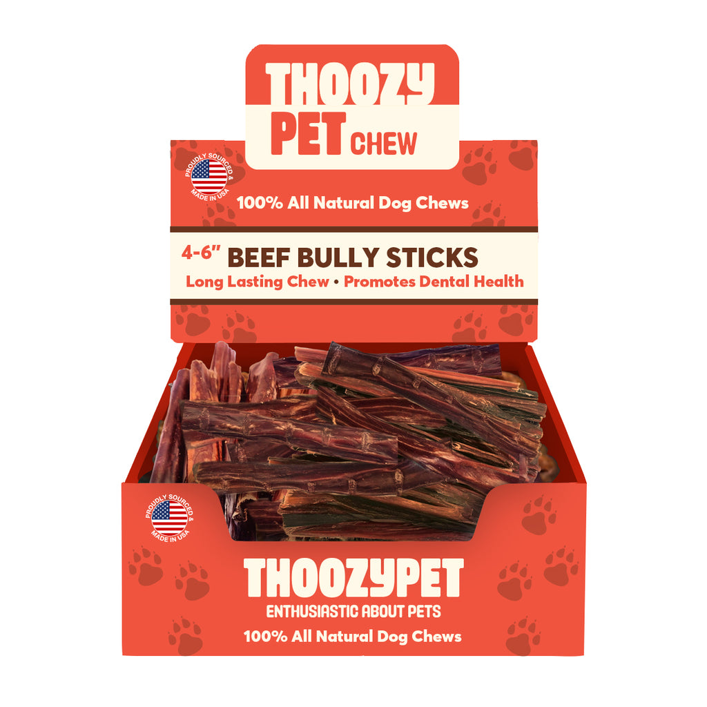 ThoozyPet USA-Sourced Beef Bully Stick Dog Chews are a safe, easily digestible alternative to rawhide that offers both a delicious treat and dental benefits. Made from high-quality, protein-rich beef, these long-lasting bully sticks provide a satisfying chewing experience for your pup. As your dog chews, the natural friction helps reduce plaque and tartar buildup, promoting healthy teeth and gums with each crunch. Perfect for power chewers, these durable treats keep dogs entertained while supporting their dental health. A must-have for both tasty enjoyment and oral care!