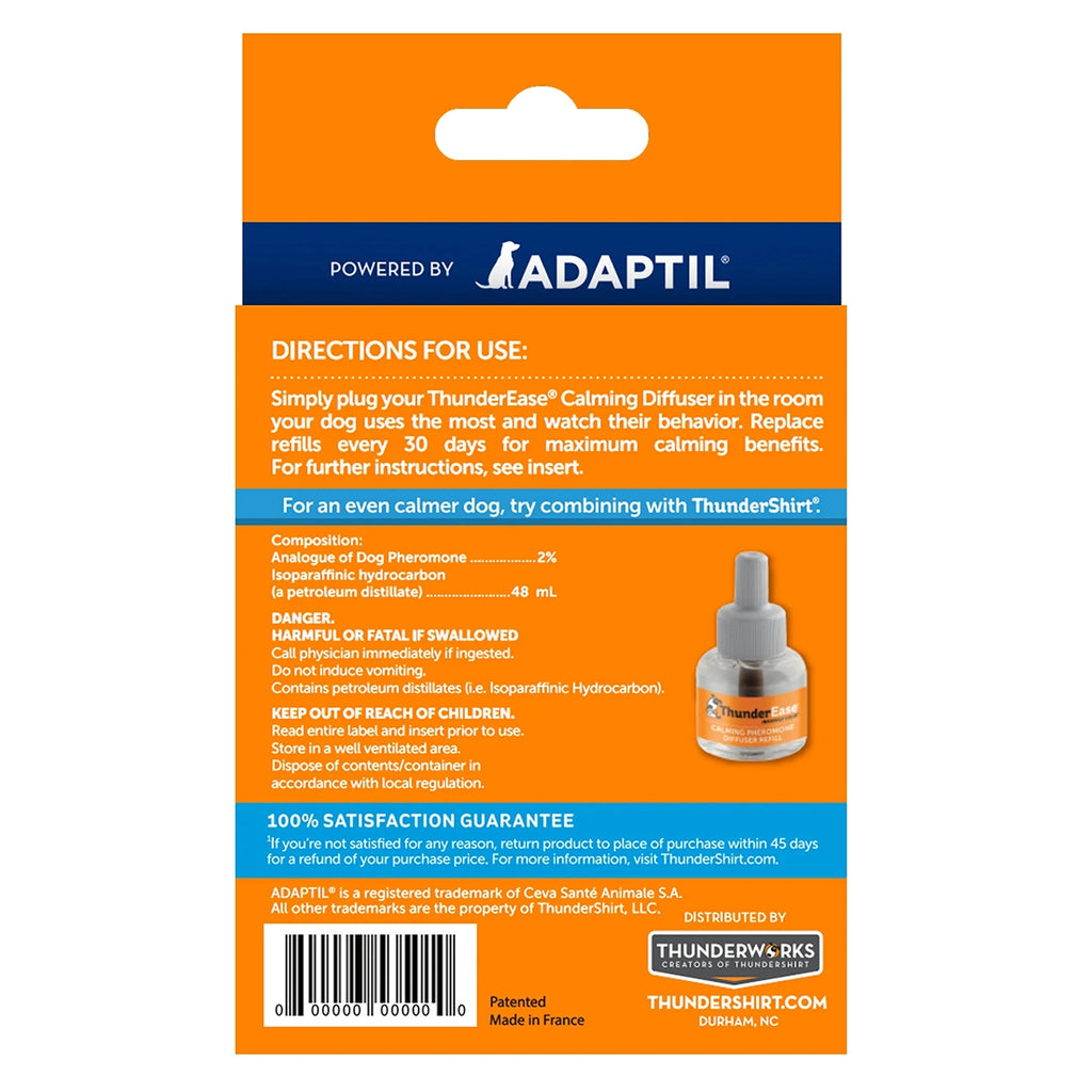 ThunderEase® for Dogs heated diffuser and refill provide calming pheromones continually for up to 30 days in a 700 square foot area.