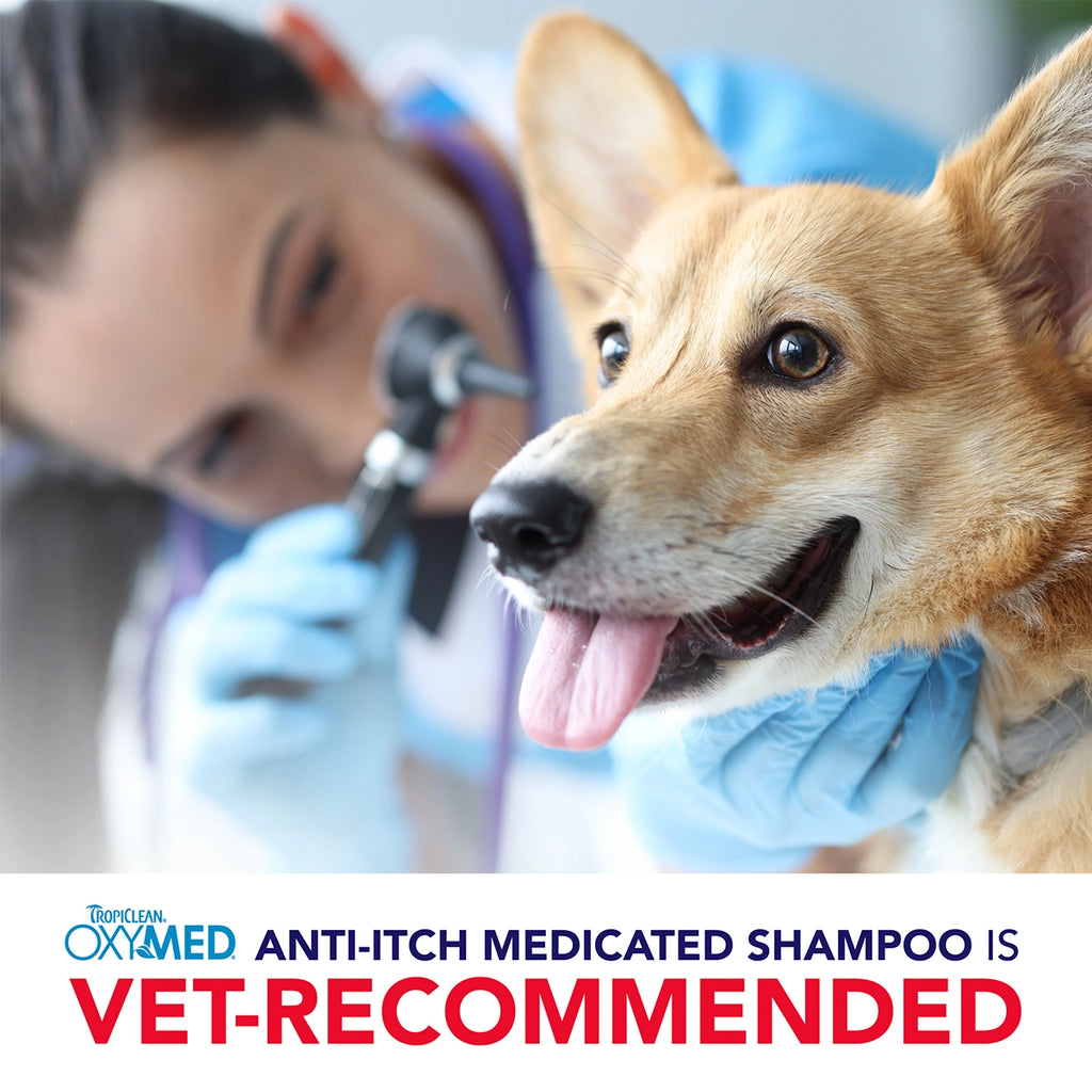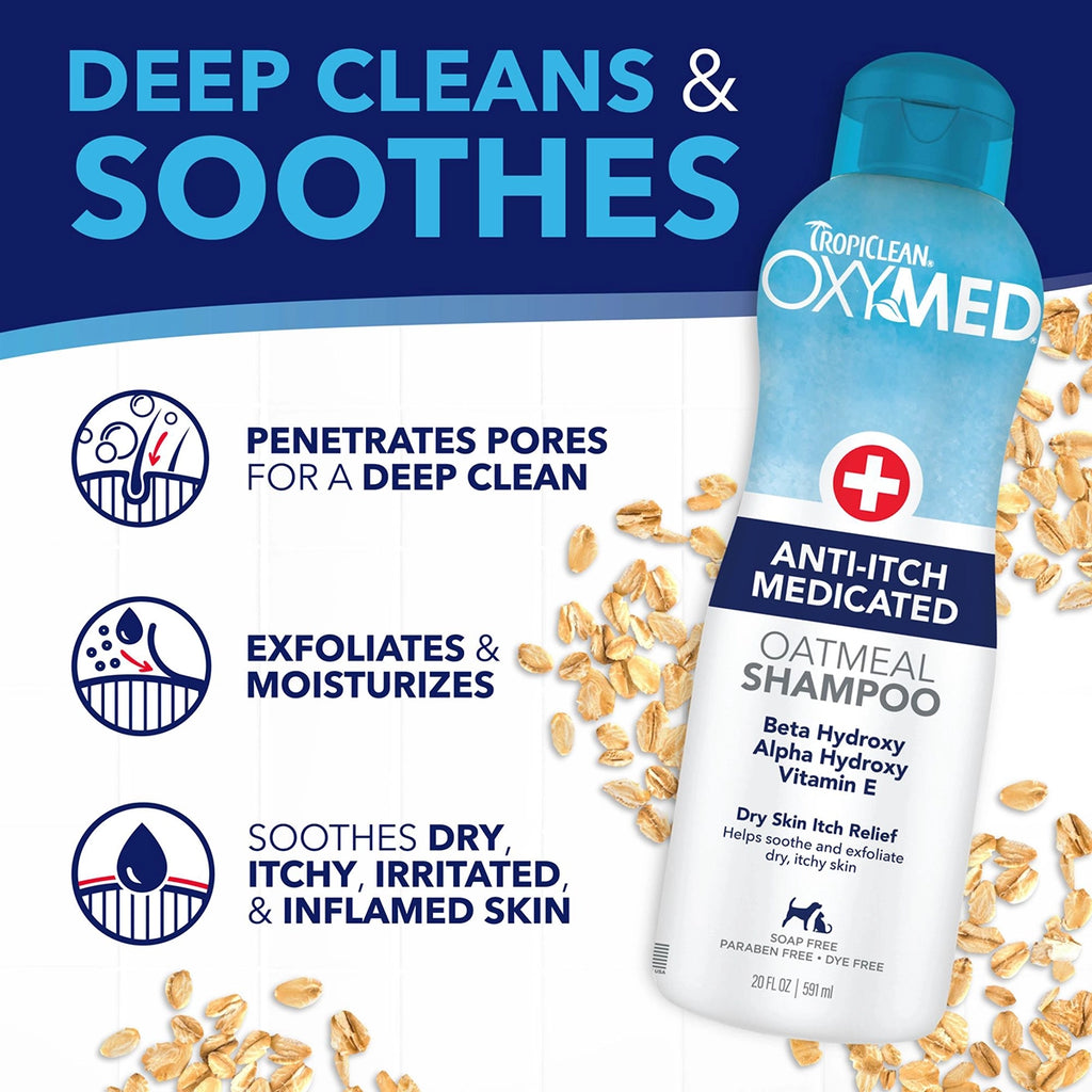 OxyMed Dry Skin Itch Relief Medicated Shampoo contains a gentle yet powerful combination of alpha hydroxy, beta hydroxy, and tea tree oil that exfoliates the skin’s surface and penetrates deep into the pores to cleanse and help soothe dry, itchy, irritated, and inflamed skin. This refreshing, deep-cleansing dog shampoo for itchy skin is enhanced to effectively moisturize and condition the skin and coat while providing soothing relief from dry skin.