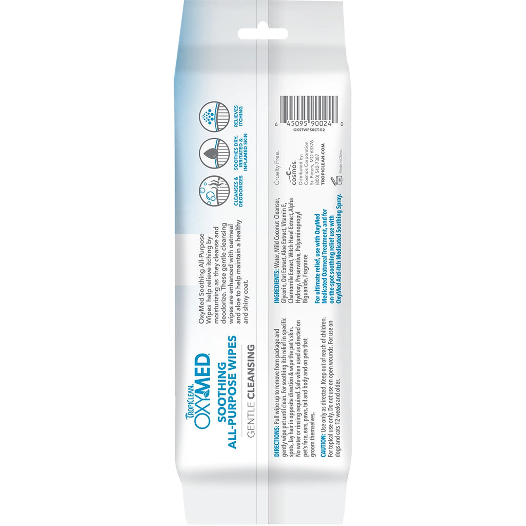 OxyMed Soothing All-Purpose Wipes help relieve itching from allergies, dandruff, and hot spots. These gentle cleansing wipes are enhanced with oatmeal and aloe extracts to help soothe and moisturize dry, itchy skin.