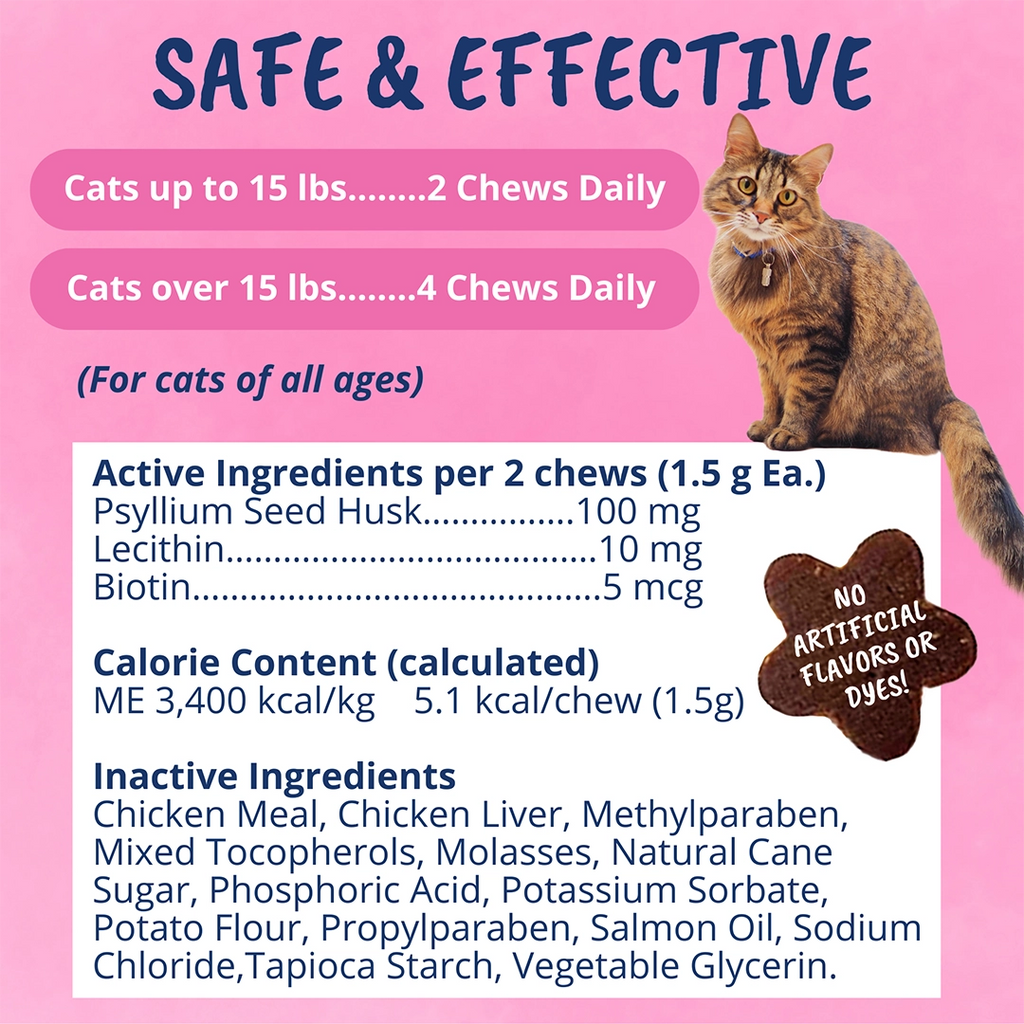 - Helps your feline eliminate hairballs with natural fiber from psyllium seed husk.