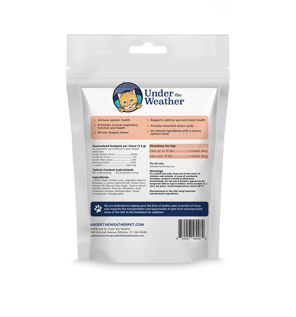 Support your cat’s everyday health with Under the Weather’s L-lysine Chews. These supplements contain a generous amount of the amino acid, L-lysine. Amino acids are important in the production of the antibodies cats need to maintain normal immune system response. Veterinarian-formulated and manufactured in Vermont, these chews are made free of corn, artificial flavors and dyes, and have a great whitefish taste your kitty will love!