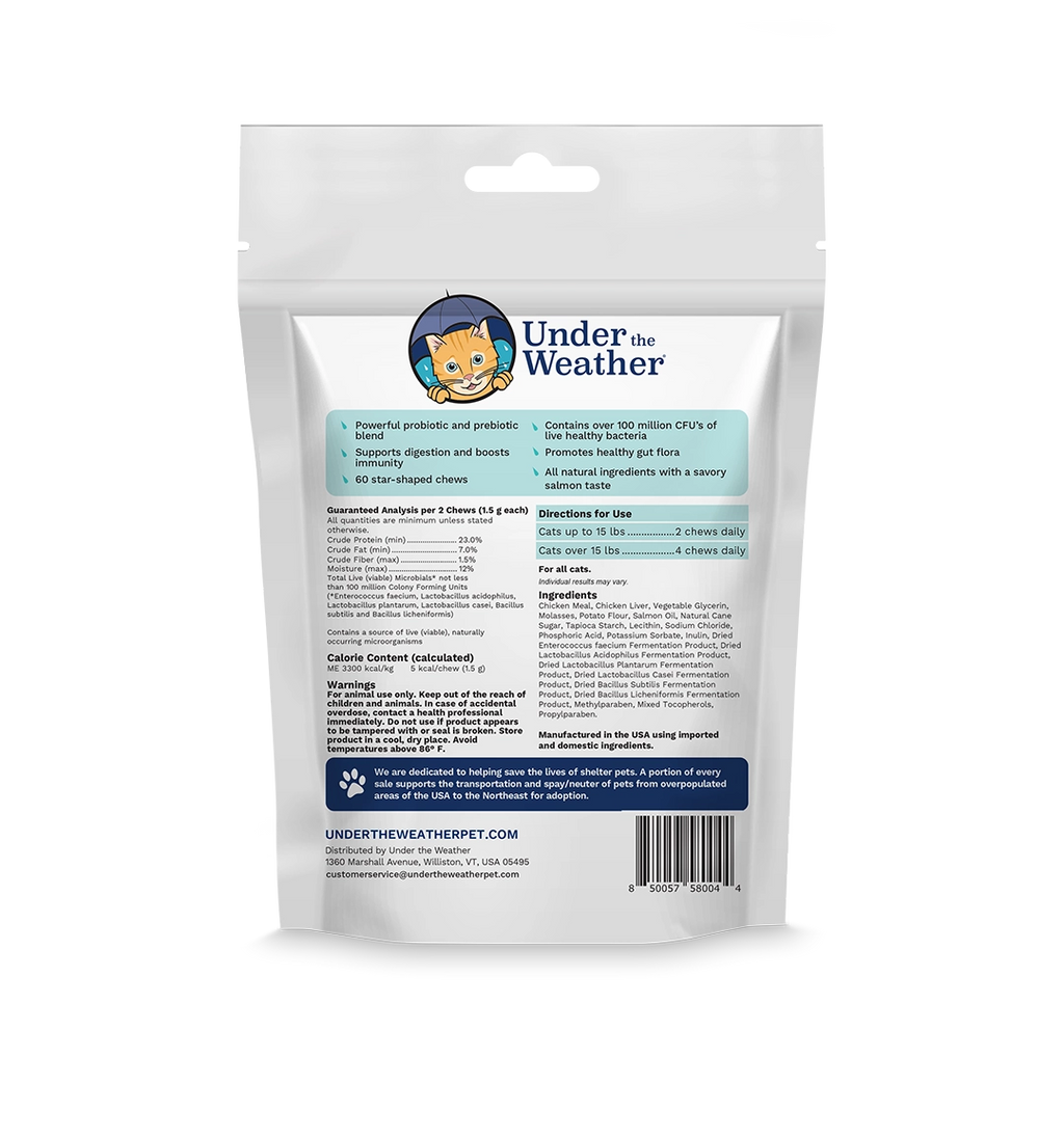 Promote your cat’s normal appetite, digestion, and immune system. When given daily, these chews help to support your cat’s overall well-being for everyday health. Contains one billion colony-forming units (CFU) of live (viable) bacteria to encourage healthy bacteria. Aids in maintaining the proper balance of beneficial bacteria and promoting a healthy immune system. Veterinarian-formulated and manufactured in Vermont, these chews are made free of corn, artificial flavors and dyes, and have a great whitefish taste your kitty will love!
