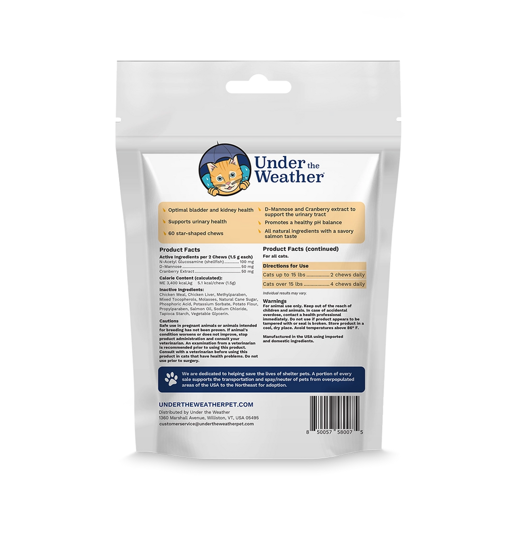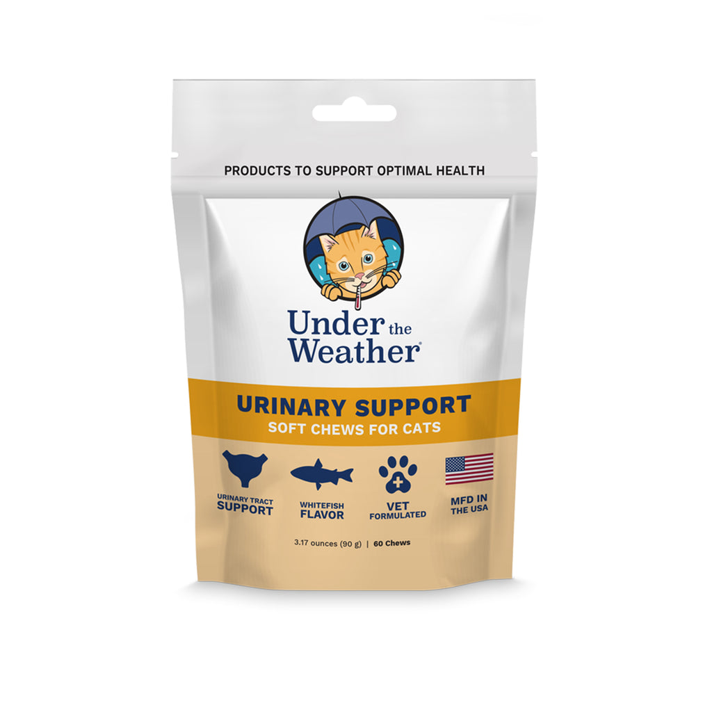 Help support your feline friend’s urinary health with Under the Weather’s Urinary Support Soft Chews Cat Supplement! It contains acetyl glucosamine to help support a normal pH balance in the urinary tract, plus D-mannose and cranberry extract to support normal urinary tract health. These soft chews are manufactured in Vermont without any corn, artificial flavors or dyes, and when given daily, can help promote overall well-being in adult cats. Plus, your feline friend will love the purr-worthy whitefish flavor!