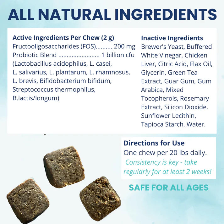 Ingredients: Active Ingredients Per Chew (2 g):Fructooligosaccharides (FOS)200 mg Probiotic Blend 1 billion cfu (Lactobacillus acidophilus, L. casei, L. salivarius, L. plantarum, L. rhamnosus, L. brevis, Bifidobacterium bifidum, Streptococcus thermophilus, B.lactis/longum