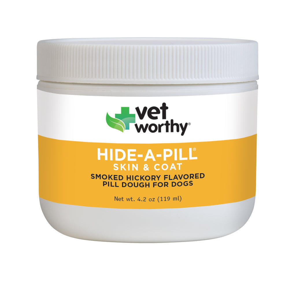 Recommended to hide medications or supplements in a tasty hickory-flavored dough your pet will think is a treat all while adding the benefits of skin and coat supporting ingredients. Unlike peanut butter, cheese and other people food used to disguise supplements and pills, this paste doesn’t interfere with weight loss efforts, so they’re terrific for pets of all ages taking long-term medication. Veterinarian formulation is recommended to support healthy skin and coat with Omega Fatty Acids and is an enticing hickory flavored pill dough that dogs love.