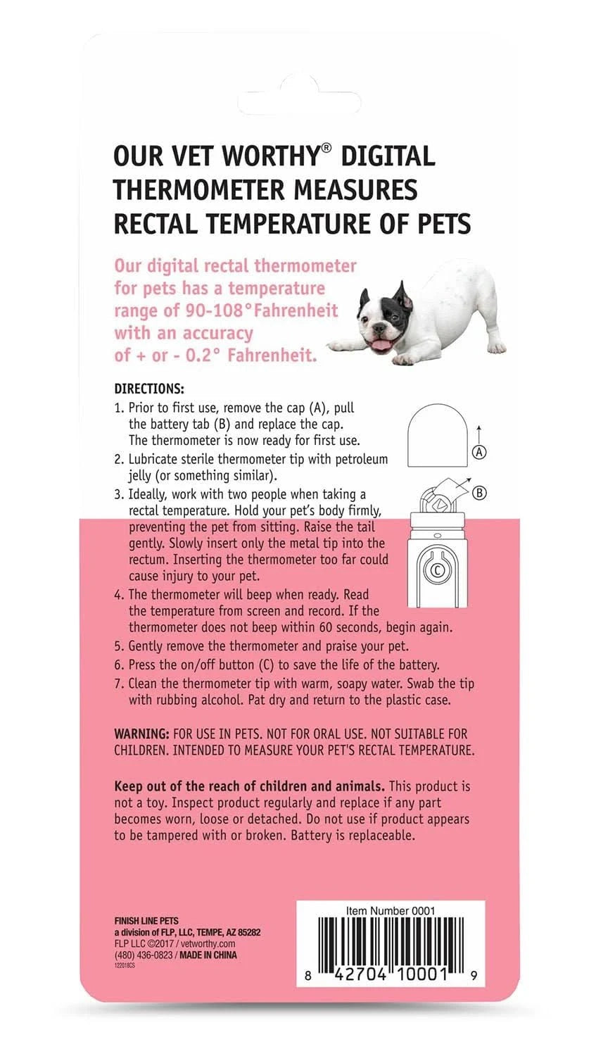 The Vet Worthy Digital Pet Thermometer is a simple solution for measuring the rectal temperature of dogs, cats, and other small animals.