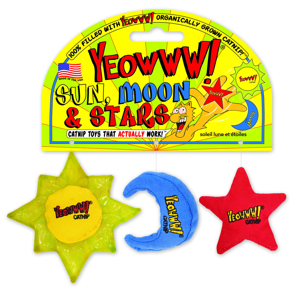 Indulge kitty with a whole constellation of fun in a small package. The set of three out-of-this-world toys features fun shapes and textures, including a crinkly solar corona. As with all Yeowww! Catnip products, the Sun, Moon & Stars are made of durable cotton twill and filled with our special 100% organically grown catnip - no fillers and no chemicals. It’s a combination sure to send even the most pampered cats into orbits of delight and keep them entertained for hours. All Yeowww! Catnip toys are 100% stuffed with USA organically grown catnip, made with durable cotton twill fabric, colored with non-bleed vegetable-based dyes, and are made in the USA.