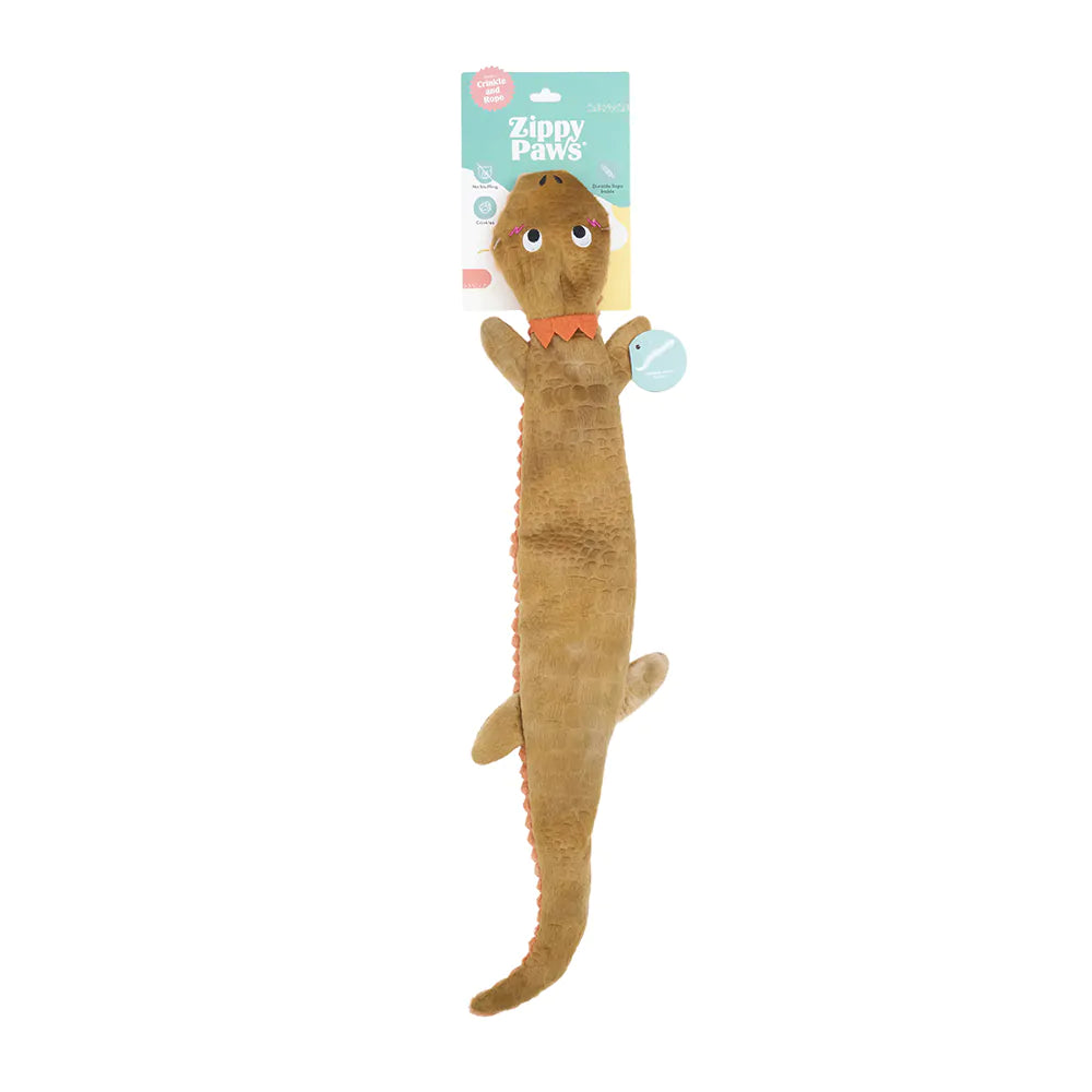 Ropetilez dog toys from ZippyPaws are built for slithery, wiggly fun and serious play! Designed with a rope that runs through the entire body, the Bearded Dragon delivers tug-ready durability with a lightweight, no-stuffing design. Crinkle material and assorted fabrics keep dogs engaged from head to tail.The Ropetilez Bearded Dragon features a rope that runs through the full length of the toy for interactive tug and shake play. No stuffing for less mess. Crinkle material adds enticing sound and texture. Made with assorted fun fabrics and finished with corduroy fabric on the stomach. Embroidered and printed details.