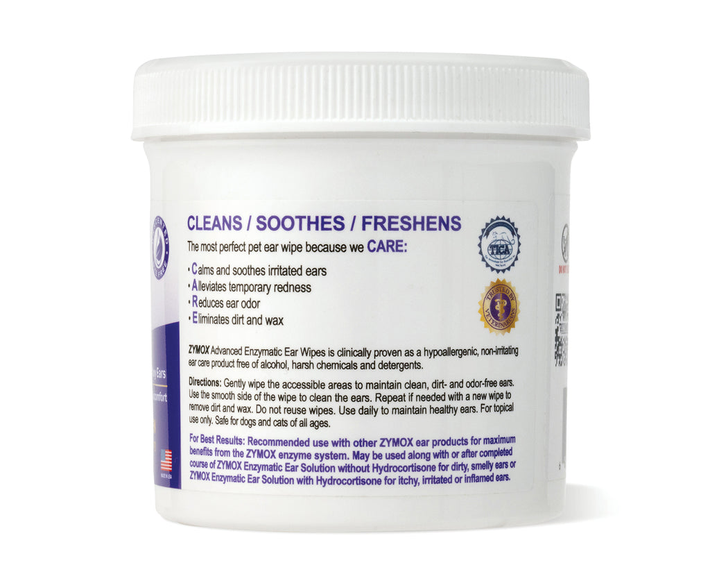 ZYMOX Ear Wipes clinically proven hypoallergenic and non-irritating & are perfect for daily use on dog or cats' ears.* Each 6 oz. jar contains 100 wipes that feature a textured back for easy grip by the pet parent or groomer. The Ear Wipes contain Aloe Vera which helps to alleviate temporary redness and discomfort by calming and moisturizing the skin, and menthyl lactate that helps to soothe irritated skin. They're also fragrance-free, dye-free and free of alcohol, harsh chemicals and detergents that can irritate pets' ears. Use wipes only with other ZYMOX products to retain the enzymes' efficiency and for optimized results. Jar allows easy storage and is convenient for traveling.